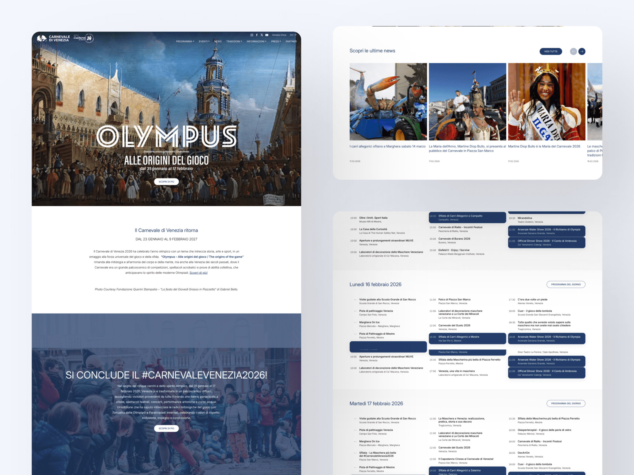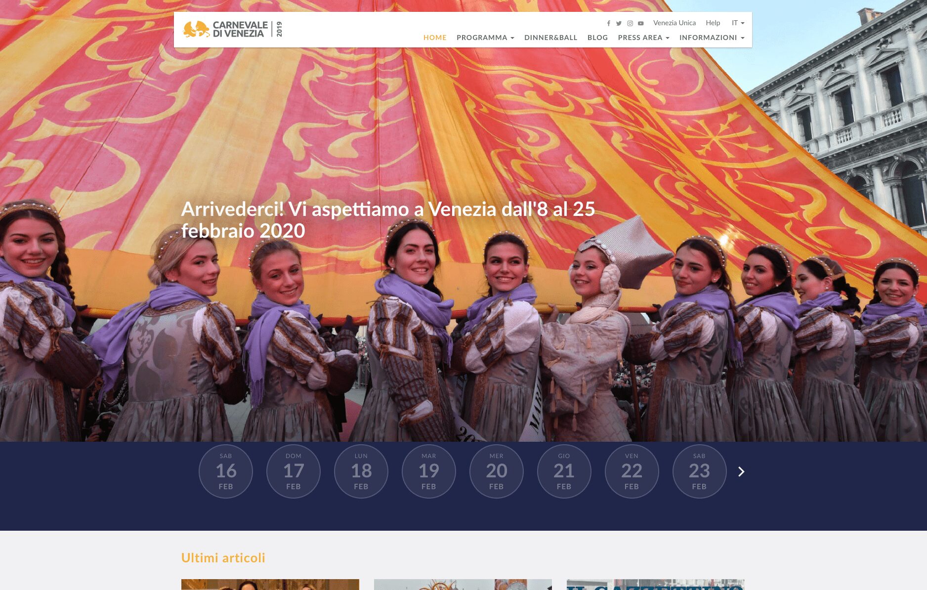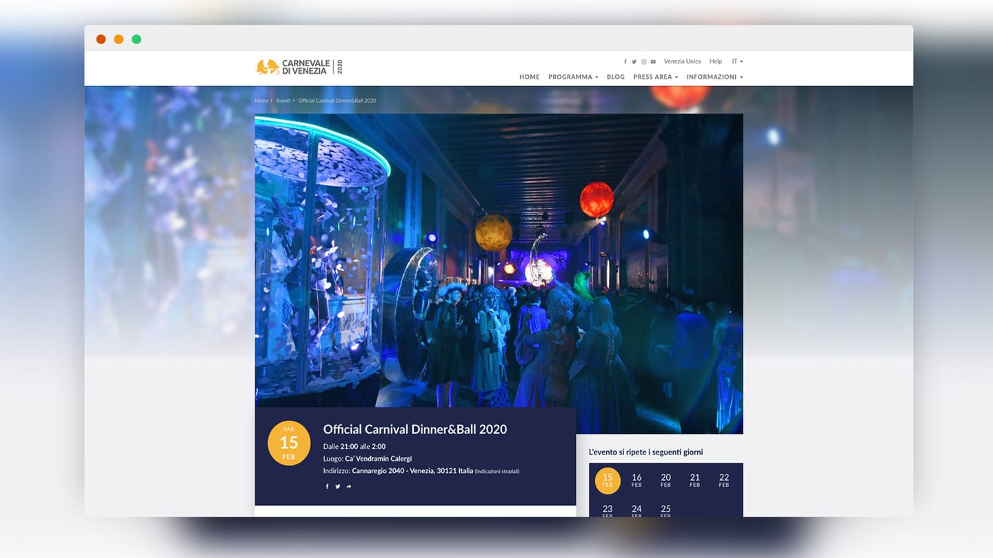 Sito ufficiale e piattaforma digitale del Carnevale di Venezia, uno degli eventi culturali più iconici d'Italia. Dal 2018 Newwave cura l'architettura digitale dell'evento: calendario interattivo, mappa delle location e comunicazione multilingue per un pubblico globale.