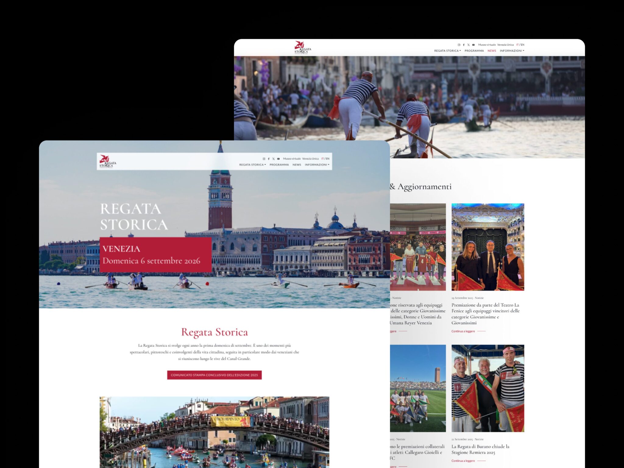 La Regata Storica è un evento stratificato: competizione sportiva, rievocazione storica, patrimonio culturale. Il sito doveva servire pubblici diversi: il turista che cercava data e orari, il veneziano che voleva seguire le gare, il giornalista che cercava materiale stampa.