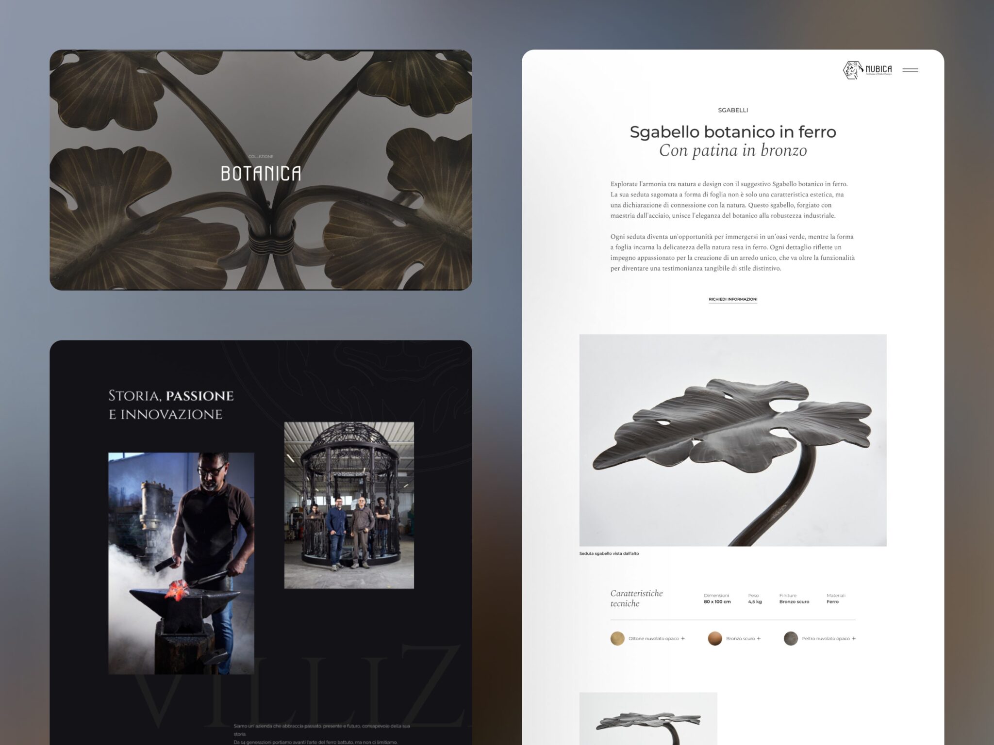 Rebranding e architettura digitale per uno studio artigianale con oltre 360 anni di storia. Due siti, VilliZanini e il nuovo marchio Nubica, progettati per tradurre in digitale la precisione del ferro battuto d'arte con un linguaggio visivo contemporaneo.